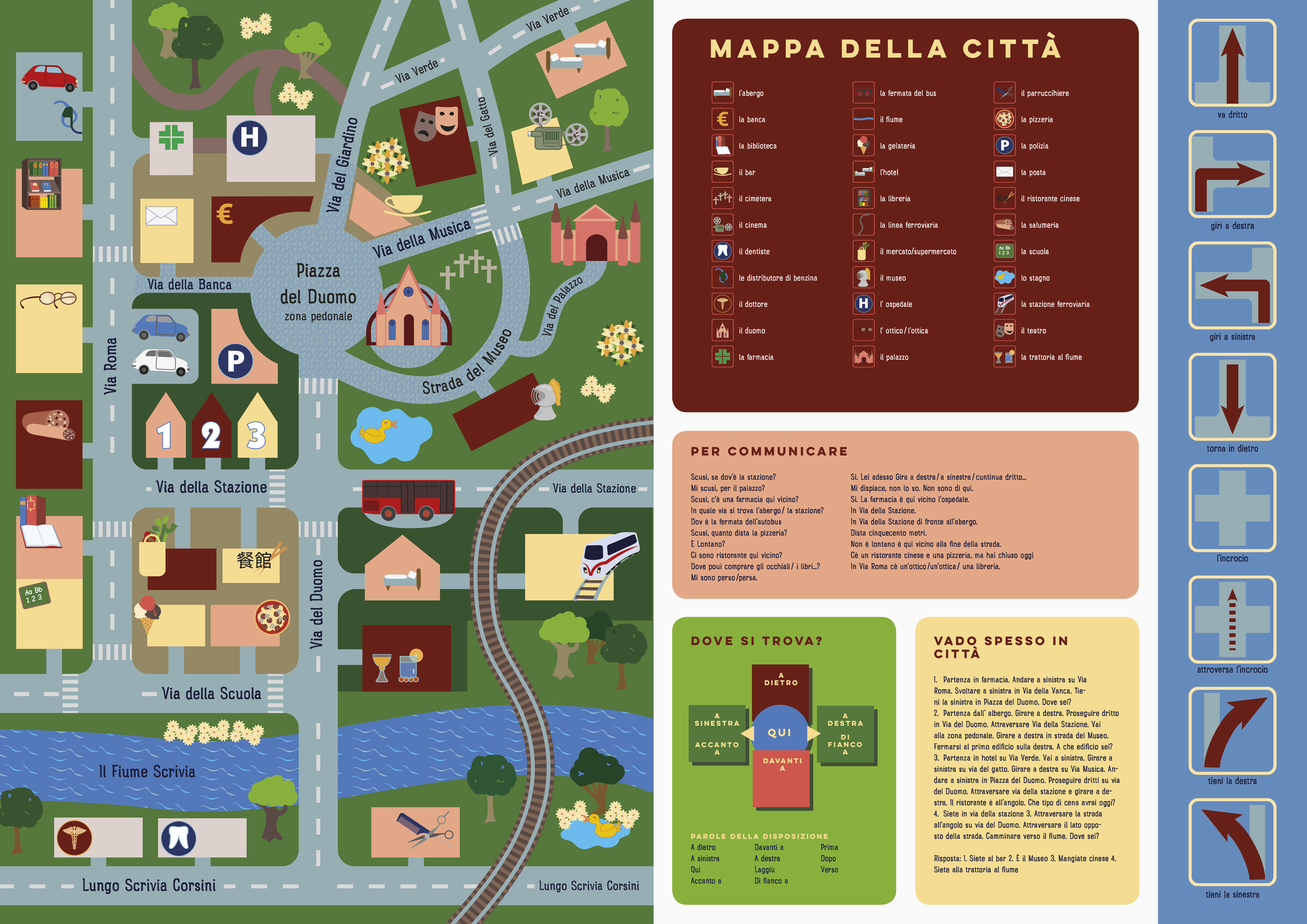 On the right side of the city map (il piante della città) you’ll find the key. The learner can actively move his finger over it while pronouncing the term. The physical action coupled with the pronunciation makes it easier to anchor the word in memory.